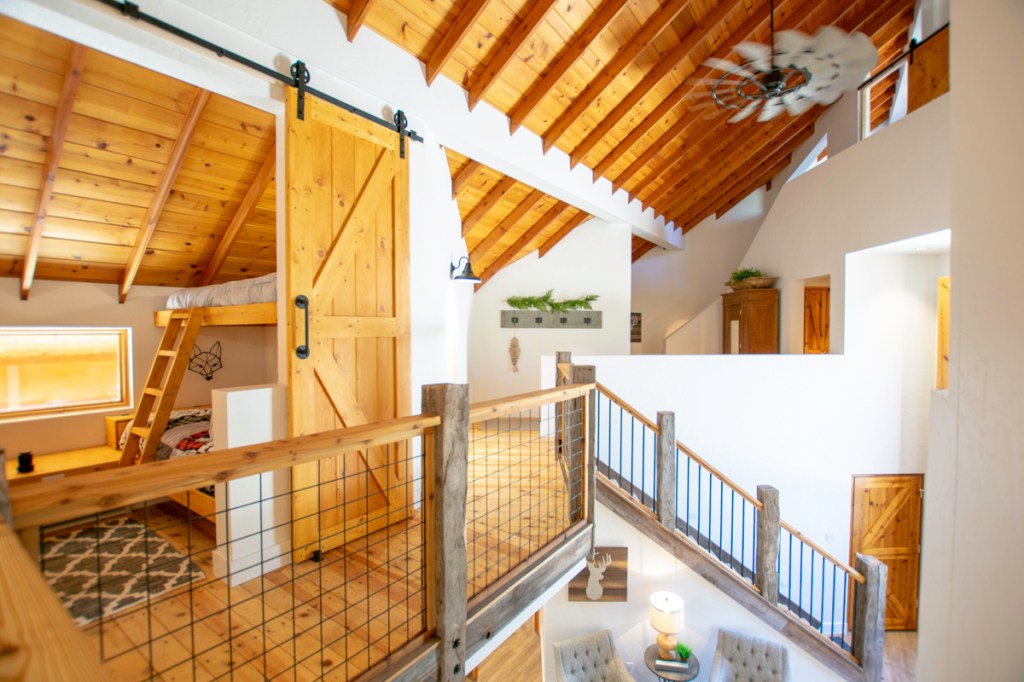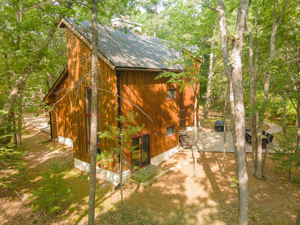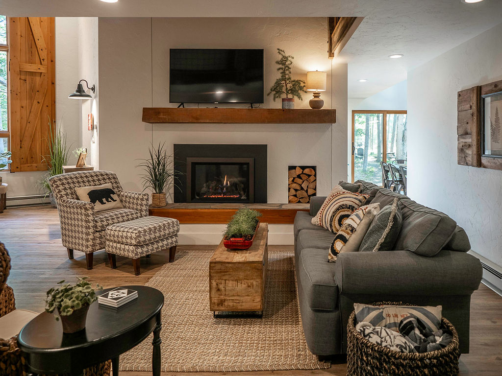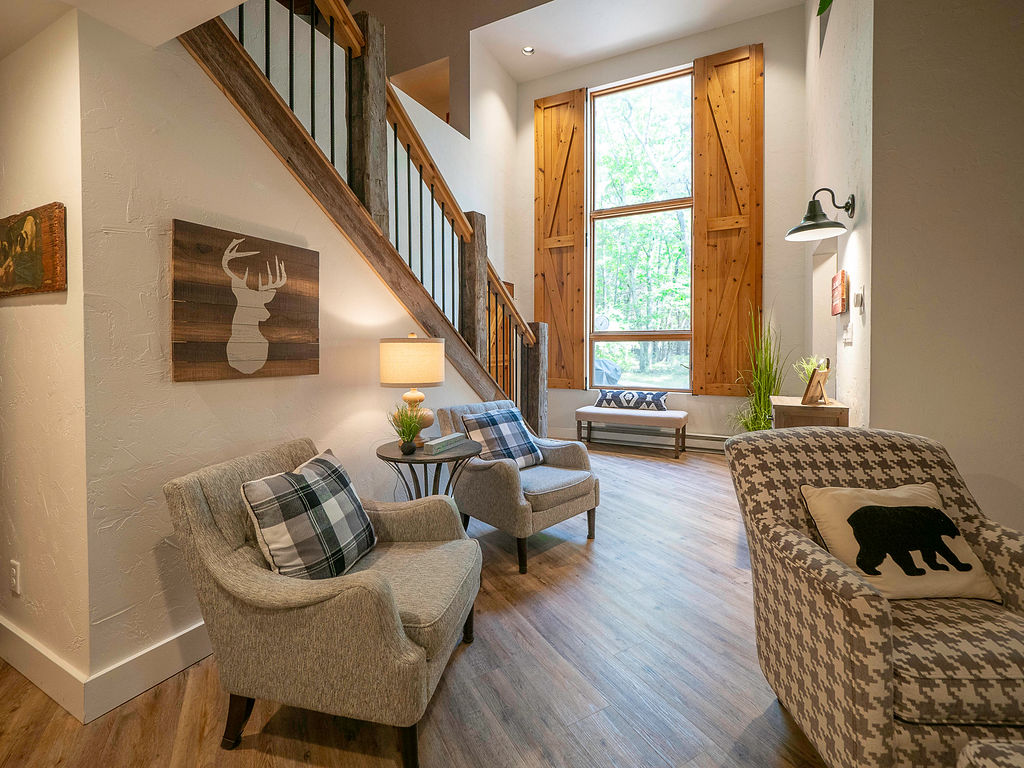 The open layout lets you look out over the main living space from the third level, while the 15-foot windows bring the outdoors in. Keep an eye out for deer passing by just outside.